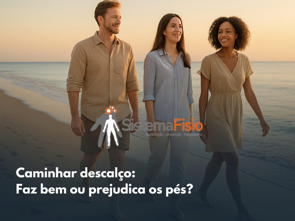 Três pessoas caminhando descalças na praia ao pôr do sol, simbolizando a liberdade de movimento e a superação da dor no joelho ao caminhar com o Sistema Fisio
